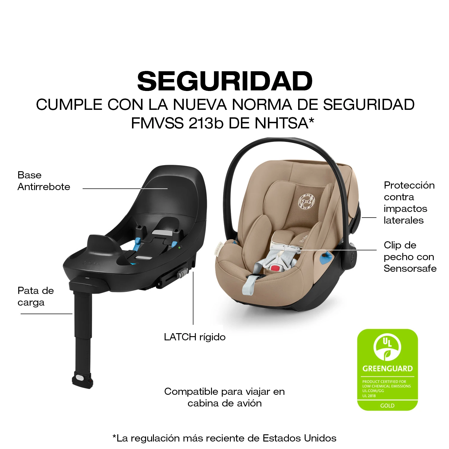 Cumple con la normativa americana FMVSS 213a y FMVSS 213b, incluyendo los estándares actualizados de impacto frontal y lateral. En caso de colisión, su base con barra anti-rebote y pata de carga ayuda a absorber la energía y reducir las fuerzas de impacto que actúan sobre el niño. La Silla para Carro Bebé Cybex Cloud G Pro trabaja en conjunto con la Protección Lineal contra Impactos Laterales (L.S.P.) y la carcasa absorbente de energía para ofrecer un entorno de viaje más seguro.