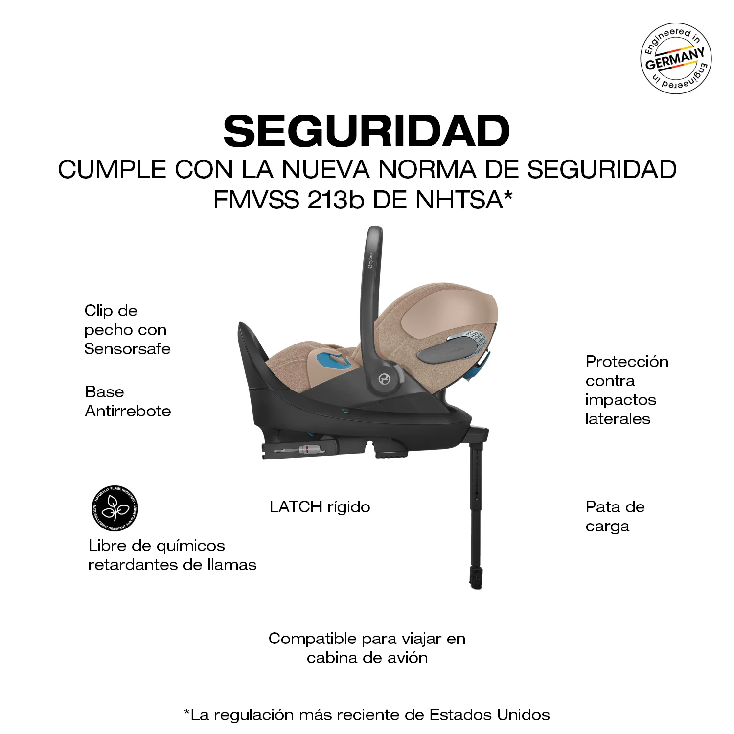 La Silla para Carro Bebé Cybex Cloud T con SensorSafe Cumple con la normativa FMVSS 213 de Estados Unidos, marca el inicio de un viaje seguro, inteligente y confortable, integrando tecnología avanzada, ergonomía superior y diseño premium desde los primeros días de vida.