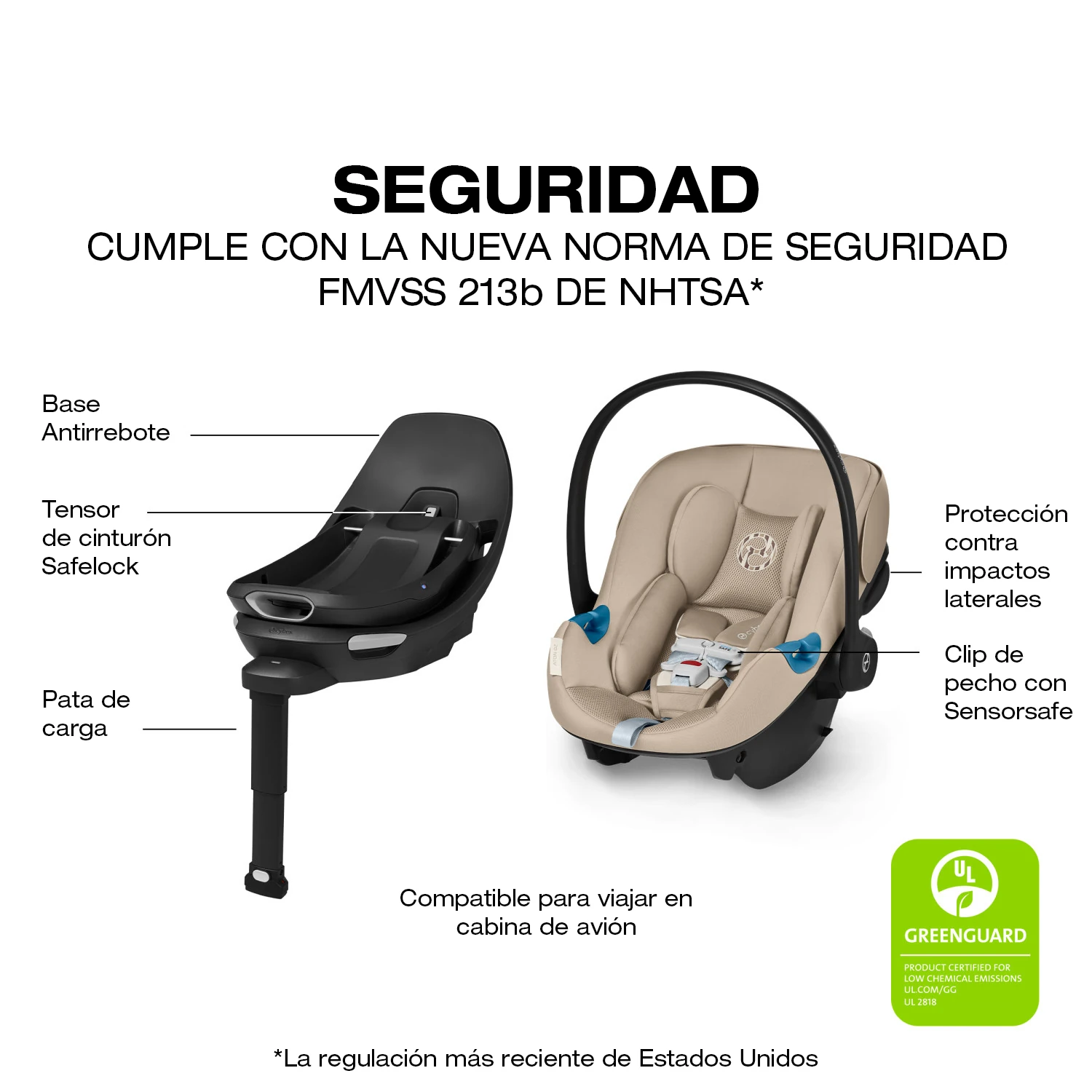La experiencia se complementa con SensorSafe Smart Technology, un sistema de monitoreo inteligente que se conecta al celular vía Bluetooth y envía alertas en tiempo real si el clip de pecho se desabrocha, si la temperatura del asiento trasero es inadecuada o si el bebé queda accidentalmente en el vehículo. Todo esto bajo certificación GREENGUARD Gold, garantizando materiales de bajas emisiones químicas.
